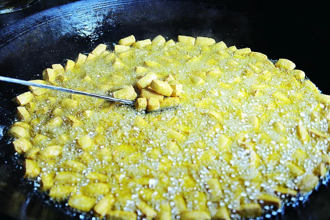 口袋豆腐的制作時,先把做好的豆腐壓緊發(fā)酵, 然后切成小方塊放入油鍋,炸到皮呈金黃脆殼,用漏勺撈出放入土堿水中浸泡,而土堿水中浸泡環(huán)節(jié)則最為關鍵。