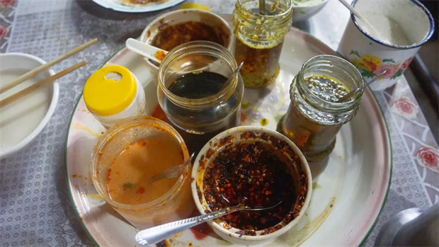 烤好的飯團(tuán)可以搭配十幾種醬料,燒椒醬、各種麻辣醬、花生碎、水豆豉、折耳根醬……吃烤飯團(tuán)當(dāng)然得配上燒椒醬啦!先抹上一層麻辣醬,再來(lái)上兩勺燒椒醬,一勺水豆豉、一勺花生碎,一口下去,簡(jiǎn)直不要太完美!