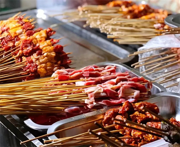 夜晚的燒烤攤最是熱鬧,牛肉、羊肉、五花肉,各種肉類、蔬菜串成串,整整齊齊地?cái)[放在盤子里,任由你挑選。