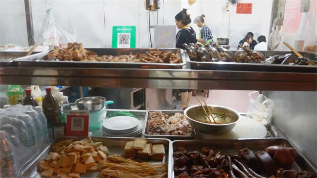 夜晚的店里分門別類的擺放著鹵好的豬頭肉、豬耳朵、肥腸、豬肚、豬尾巴、豬心、豬肝等十幾種部位,隨便選上你喜歡吃的幾種,加上特制的鹵湯,加上自己心儀的各種調(diào)料,一碗美味的燒臘就完成了。