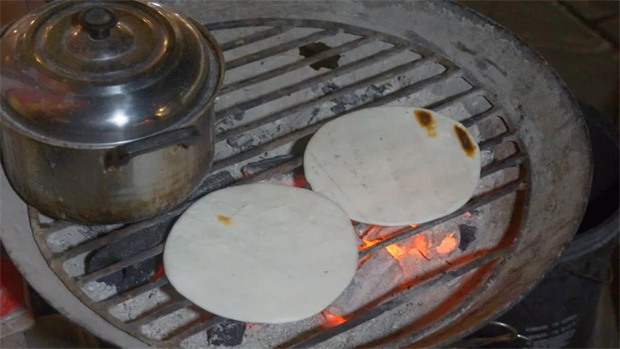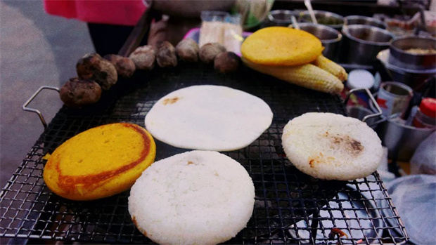 飯團(tuán)是奶奶提前捏成一個(gè)個(gè)圓形的餅狀,放在炭火上慢慢烤,先均勻地刷上一層香油,再撒上一些草果面,等炭火把表面烤至金黃時(shí)就好了。
