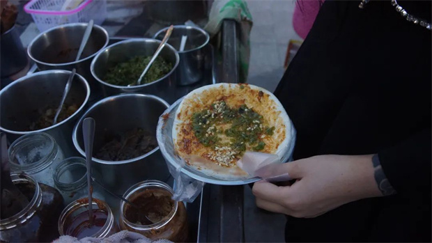 烤好的風(fēng)吹粑粑,在表面抹上辣醬、花生碎,又或是舀上一勺稀豆粉,一口下去,既有被炭火烤得酥脆的米香,又有各種調(diào)料帶來(lái)的麻辣鮮香。