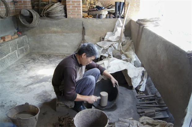 1. 選泥與打泥:制作土鍋子首先選用粘性較好的膠泥,加入細(xì)沙和水?dāng)嚢?,然后用石錘使勁錘打,此為“打泥”,打好的泥