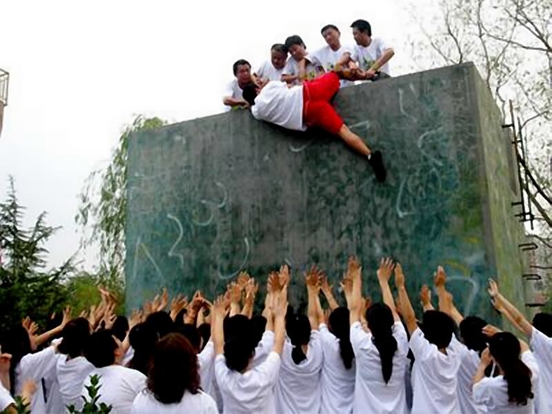 這個項目要讓學員懂得個人目標與團隊目標的關系,只有團隊獲得勝利才有真正的勝利。全隊所有成員在規定的時間內翻越一面高4.2米的光滑墻面,在此過程中,大家不能借助任何外界的工具,包括:衣服、皮帶、繩子等。所能用的資源只有每個人的身體。