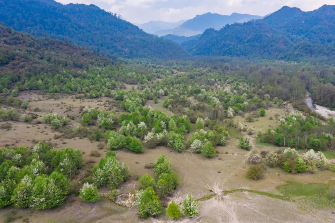 通過(guò)無(wú)人機(jī)的視角,從半空望下去,千樹(shù)梨花如銀龍伏于地上,蔚為壯觀!這里無(wú)垠的高原草甸、緩緩流淌的小溪、歡哞食草的牛馬……形成一幅絕美靈動(dòng)的自然畫卷。