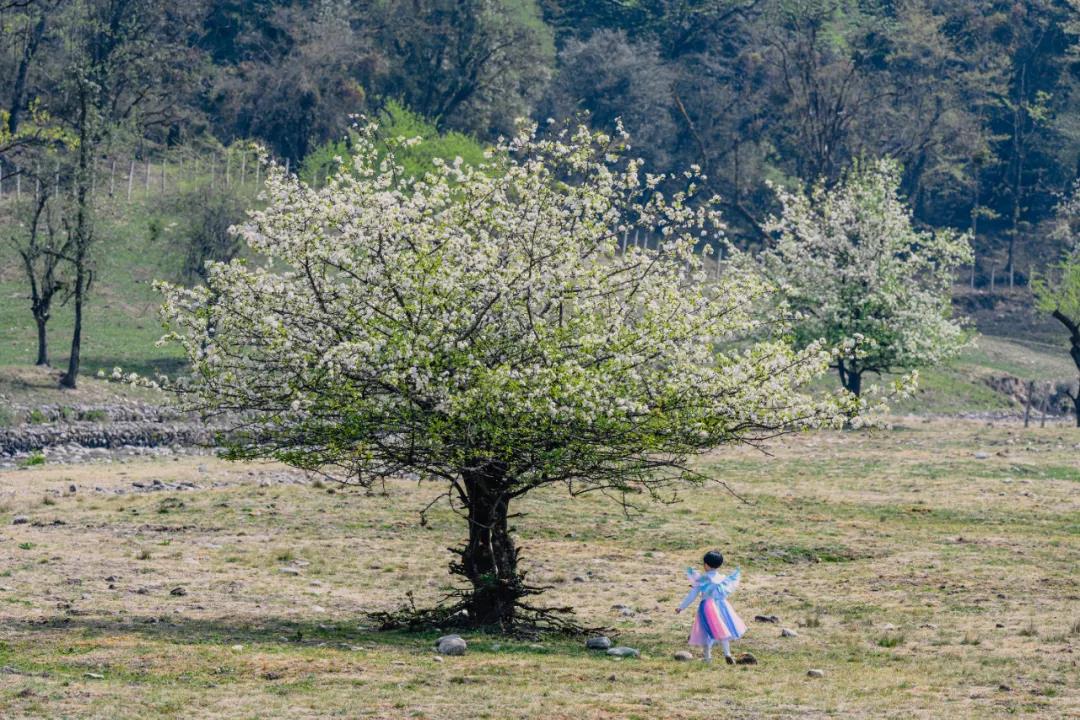 有別于庭院梨花的靜謐之美,大竹壩的棠梨花,因隱藏于一片少有人涉足的極邊秘境,樹(shù)樹(shù)梨花開(kāi)滿原野,有一種原生態(tài)的“野性”之美,令人向往不已!