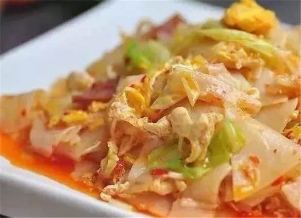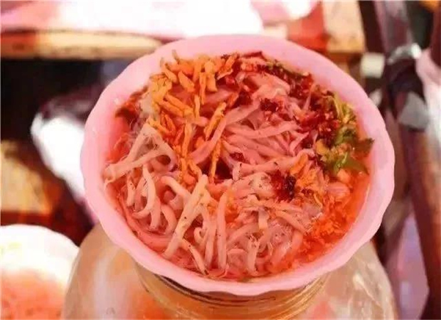 擦粉是用甜蕎面制成的涼粉,吃法多,調(diào)料也多,但必須用當(dāng)?shù)氐拿纷哟住rv沖擦粉雖好吃,但卻不開店專營,都是挑著小擔(dān)子沿街銷售。